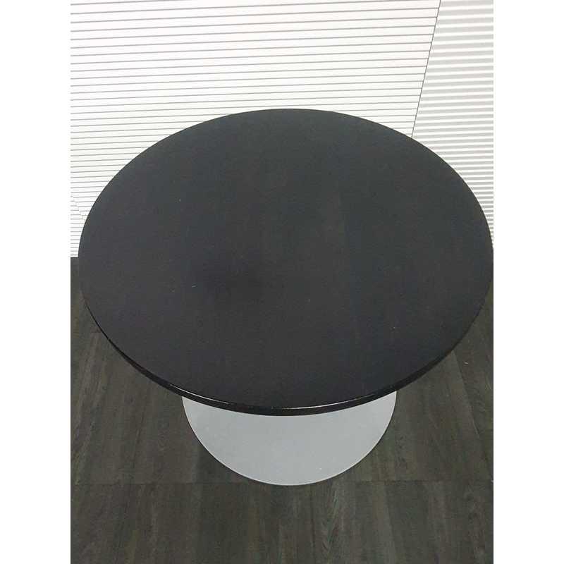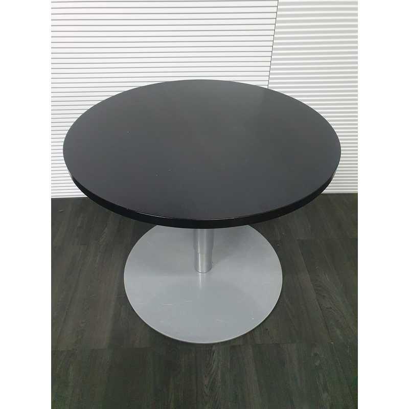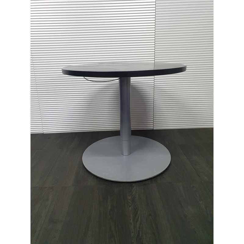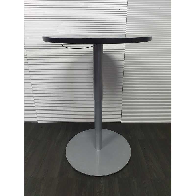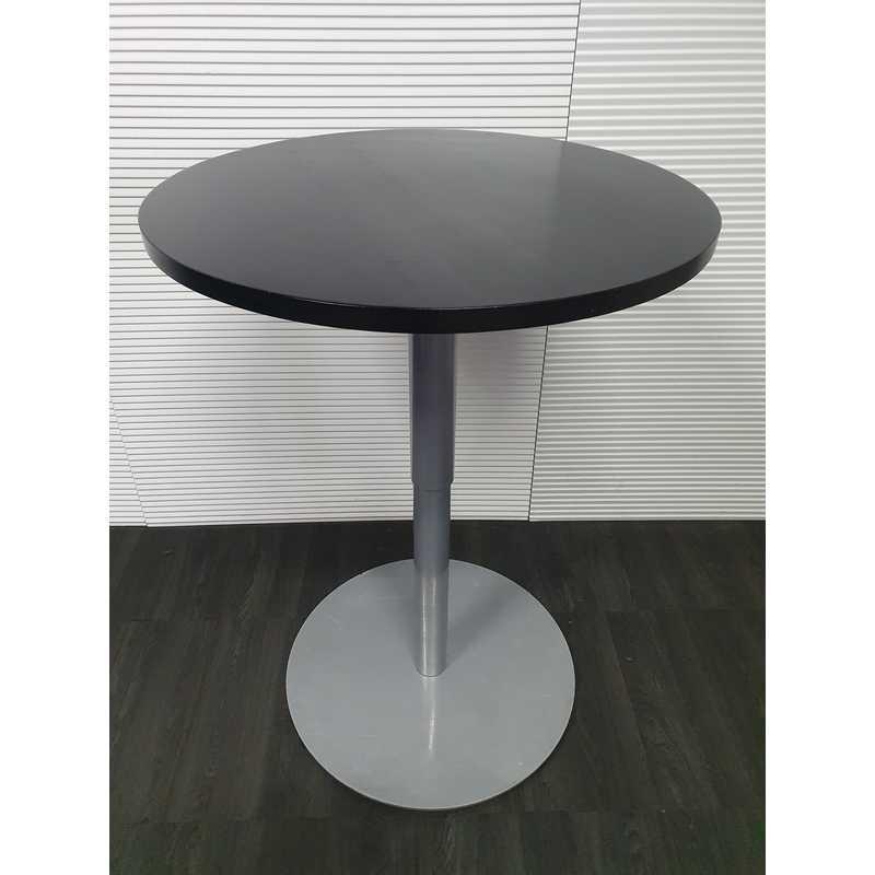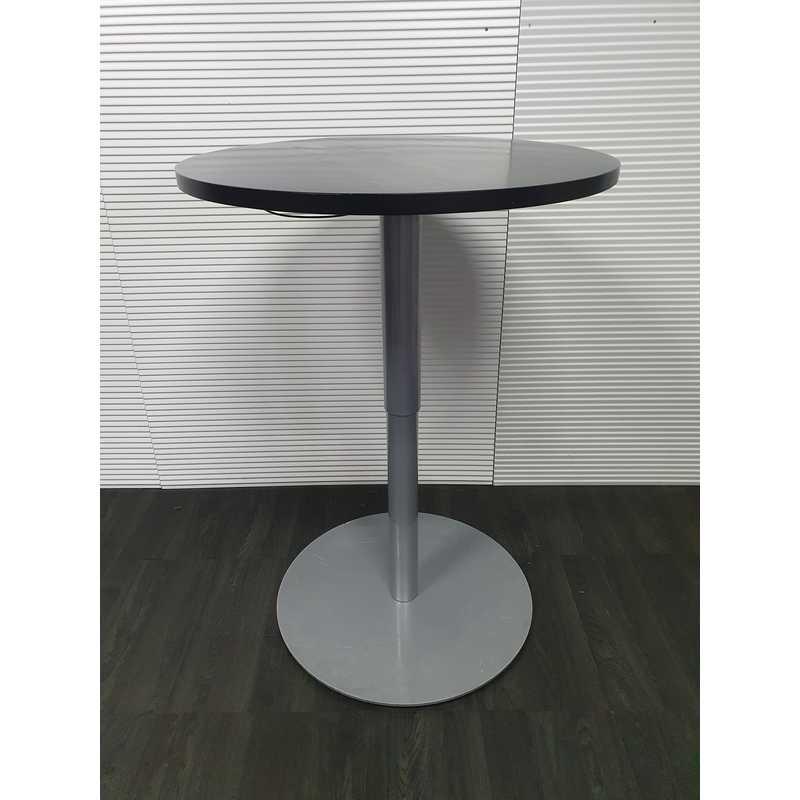 Satelliet Statafel, hoogte verstelbaar 69-113 rond 80cm, zilvergrijs metalen zware poot met zwartbruin massief houten blad 4 cm