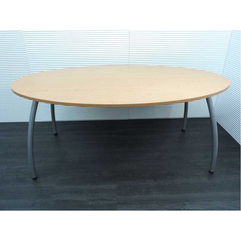Een ovale vergadertafel met beuken blad en metallic onderstel